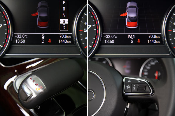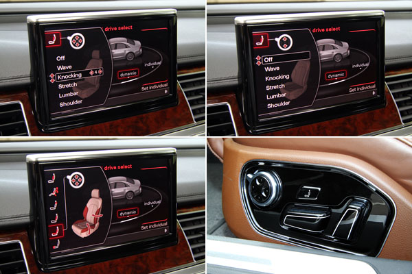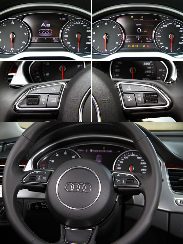此外,強調自駕的A8 3.0T 在軸距減為2992mm後,在靈活性上獲得立即的進步,感覺後軸不在那麼遙遠,也更容易掌握整體的車輛動態,而且即使車重僅僅減少了55kg,不過在前軸負載相對減輕後,加減速與高速換道時的慣性也相對減緩,其中在長軸A8 L 4.2 FSI車型上,於高速行駛時遇起伏路面所偶爾出現地漂浮感在短軸車型也獲得改善,A8 3.0T同時也配置了Audi drive select可程式車身動態系統,具有comfort〈舒適〉、auto〈自動〉、dynamic〈運動〉與individual〈車主自訂〉四種模式,而該系統所改變的範圍不僅有懸吊系統,包括油門訊號、換檔速度等都會隨之變化,在individual〈車主自訂〉模式中,駕駛可以自行搭配懸吊、變速箱、方向盤動力輔助等模式,不過在大多數的行駛過程中,我皆選擇auto〈自動〉模式,讓車輛自行判斷調整,因為原則上該系統反應頗為靈敏,在不同行駛狀況下,它皆可以提供最適切的模式,讓駕駛可以輕鬆地駕馭。