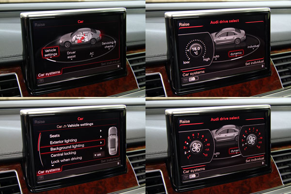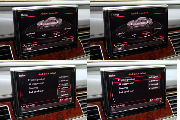 Audi drive select可程式車身動態系統,具有comfort〈舒適〉、auto〈自動〉、dynamic〈運動〉與individual〈車主自訂〉四種模式,而該系統所改變的範圍不僅有懸吊系統,包括油門訊號、換檔速度等都會隨之變化。