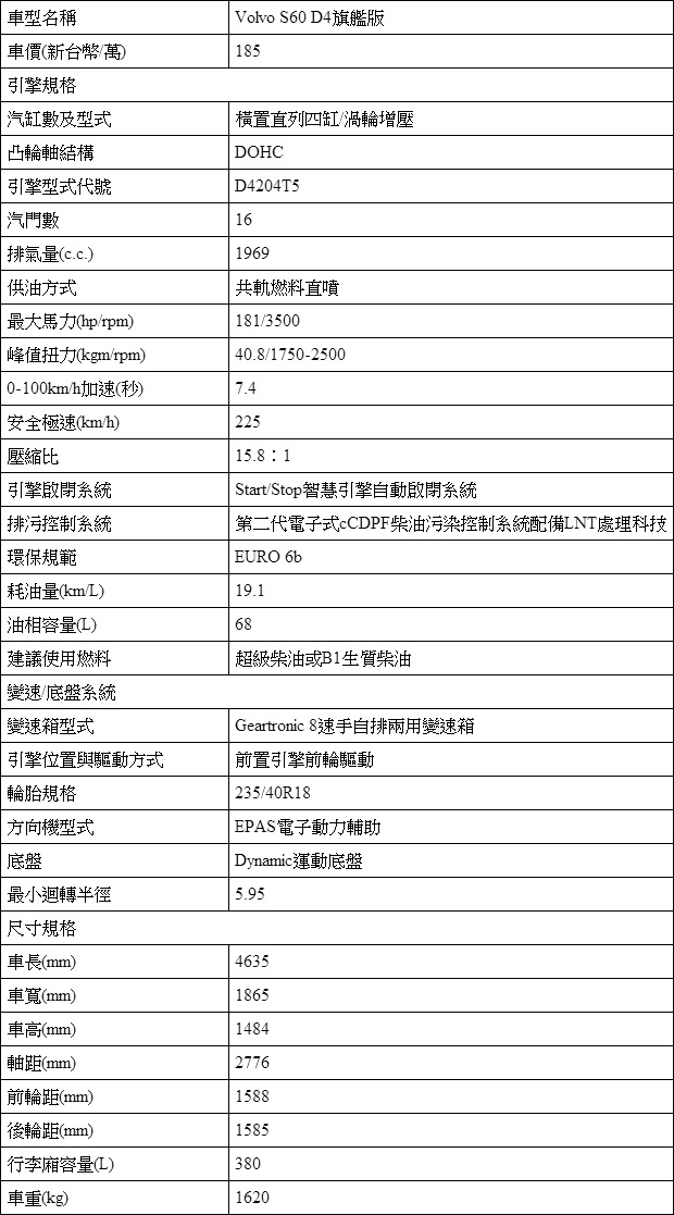 此次試駕車型為S60 D4旗艦版,車價為新台幣185萬元起。