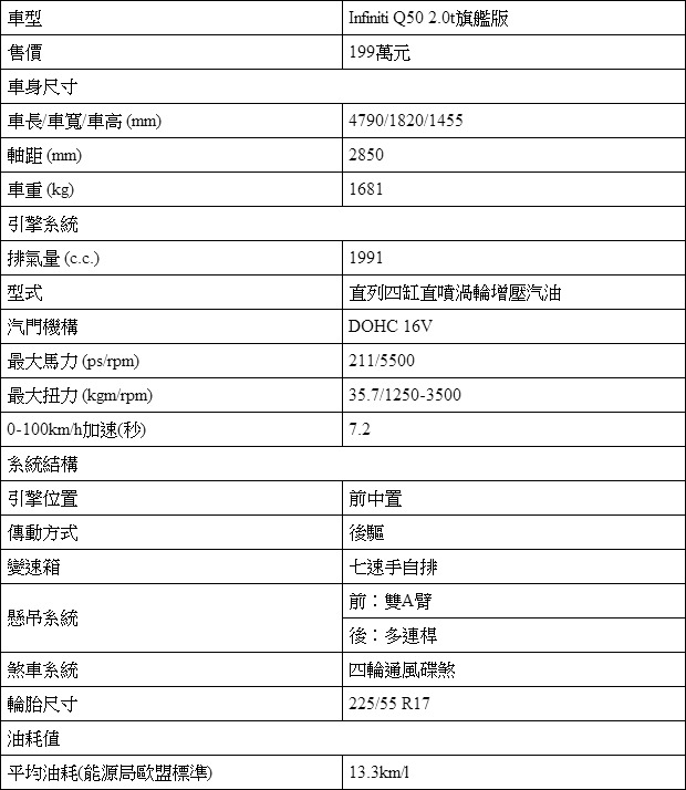 就配備齊全與行路質感精進等面向看,全新Q50 2.0t絕對擁有與諸如Mercedes-Benz C180、BMW 320i等一線強手一搏的能耐,但在品牌認同度、造型設計感等部分則仍力有未逮,特別是外觀線條走向雖然華美動感但卻不見得雋永耐看,現在才追加的小排量引擎也似乎稍嫌後知後覺,不過好在2.0t最入門豪華型僅168萬元的售價十足引人,不僅較之絕大多數德國對手都便宜好大一截,對應價位相當的Lexus IS300h各方面表現則顯然好上許多,這樣的產品對於市場來說究竟有沒有吸引力?答案當然肯定是正面的,只是能不能攫取更多準買家的注意則不得而知,再加上於房車而言又有像是Volvo S60或Mazda6、Subaru Legacy的急起直追,相似價位帶內又有高級掀背車、小型LSUV與Crossover的群體夾殺,筆者相信Q50仍有一場場的硬仗要打,作為後到者,難免仍須披荊斬棘一番才有撥雲見日的希望!