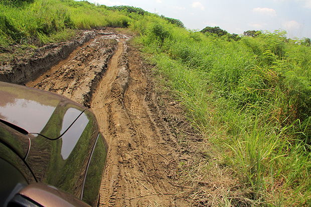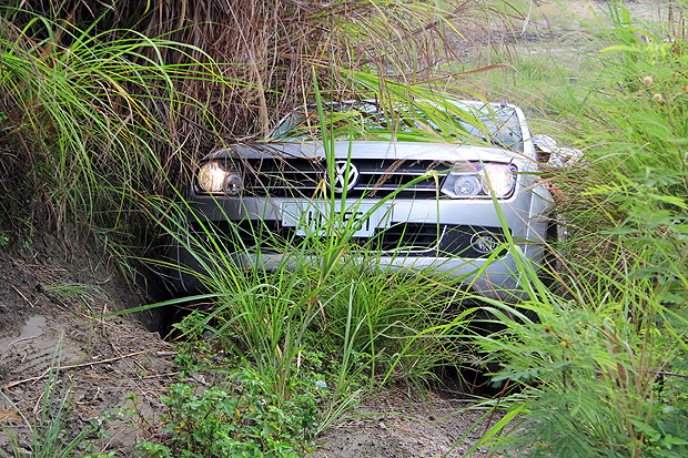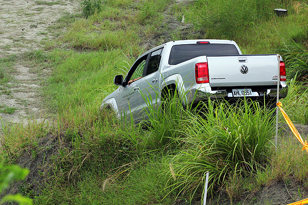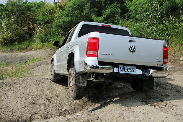 而進入越野場地前的聯外小徑,因為先前多日的大雨,加上當地土質使然,積水與泥沙早已融合成令人皺眉的爛泥。比起越野場地中所設計的陡坡緩降、40度測傾、大象坑與升坡止滑等曾經在手排版Amarok上所感受過的關卡,要如何不在進出越野場地時受困,或許才是真正考驗Amarok能力的所在。由於土壤含水頗豐,經過車輛來回穿梭,早已壓出深邃的車轍,部分路段還存有積水,難以判斷下方的深度,只能依循前車行經的路徑,減少車輛受困的機會。