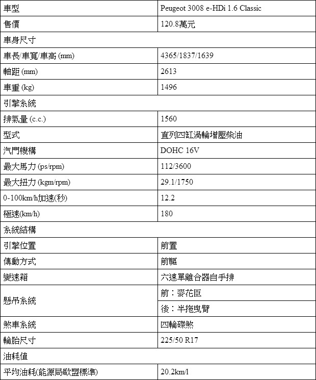 而3008 1.6 e-HDi 所擁有的112匹/3600轉最大馬力、29.1公斤米/1750轉最大扭力的輸出,在這時代聽起來確實不是多麼誘人,0-100km/h加速12.2秒、極速180km/h的成績,更可能會讓許多性能迷不住搖頭,但是如果實際駕馭,你一點也不可能會覺得有任何不足之處,頂多就是起步時轉速還未迅速提高,此刻加速稍嫌有些遲緩,不過一待1750轉峰值扭力湧現,這時推力則馬上會讓人開心得合不攏嘴,待速度起來後,渦輪增壓所帶來的飽滿力道,對比起油耗數據後更一點也沒有會讓人想挑剔之處。