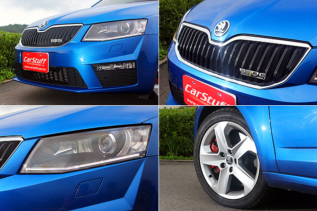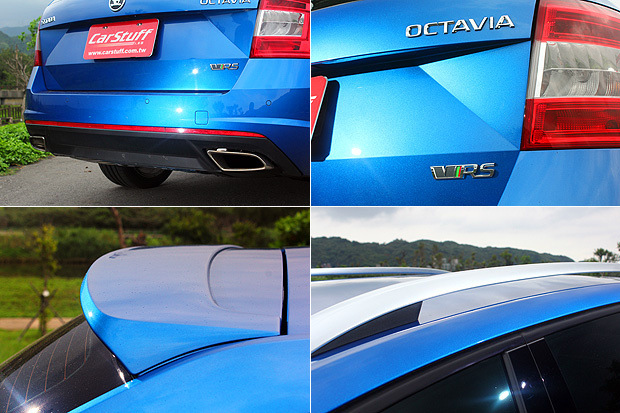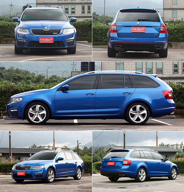 眼前的他,還披覆著臺北車展中所見到的湛藍外衣,雖然這並不是那輛輪圈造型深具侵略性的標配展示車,無可否認的,依然是血統純正的Octavia Combi RS。Škoda家族新一代的水箱護罩,搭配著有稜有角又嵌入LED晝行燈的頭燈輪廓,搭配上以外八構型佐以蜂巢網格的前保桿與氣壩設計,帶來具有Škoda家族色彩又不失性能氣息的面容。車尾保留著新一代Octavia Combi的樣貌,包括雙C型尾燈設計與現行Škoda家族車款都存有的尾門折線等,但尺寸放大的尾翼,搭配上嵌有雙出梯形尾飾管的後保桿,以及RS字樣徽飾等,都表明了這輛車的不凡身分。