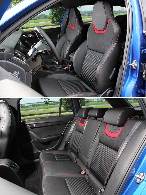 維持著與新一代Octavia相同基調的內裝設計中,Octavia Combi RS同樣透過細節的點綴,創造出更令人血脈賁張的氛圍。運用透氣真皮包覆的方向盤,不僅綴上了紅色的縫線,還同時烙上RS徽飾與方向盤換檔撥片,為了不僅是視覺的效果,抓握感與劇烈操駕時的便利性也一併兼顧。與此同時,前座兩張運用Alcantara、真皮與布紋混搭,並且烙上RS徽飾,再透過紅色縫線與色塊點綴的跑車化座椅,搭配同樣設計的後座座椅,更是讓血液中的辛烷值急劇升高。