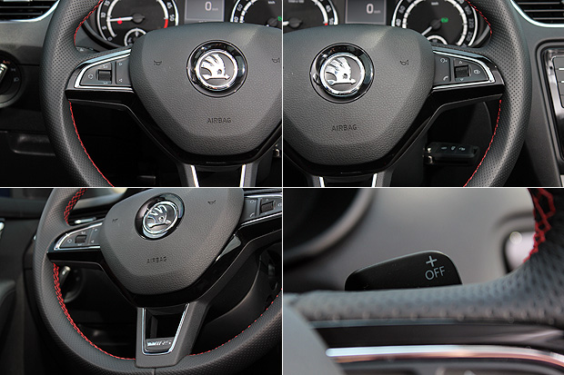 三輻式多功能方向盤不僅配有換擋撥片與RS徽飾,透氣真皮包覆搭配紅色縫線,兼具了視覺效果與抓握感。