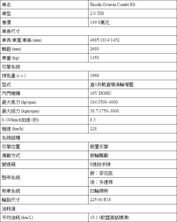 面面俱到的Octavia Combi RS 2.0 TDI個方面皆有水準之上的演出,絕對會是輛足以放入購車考量的佳作之一。