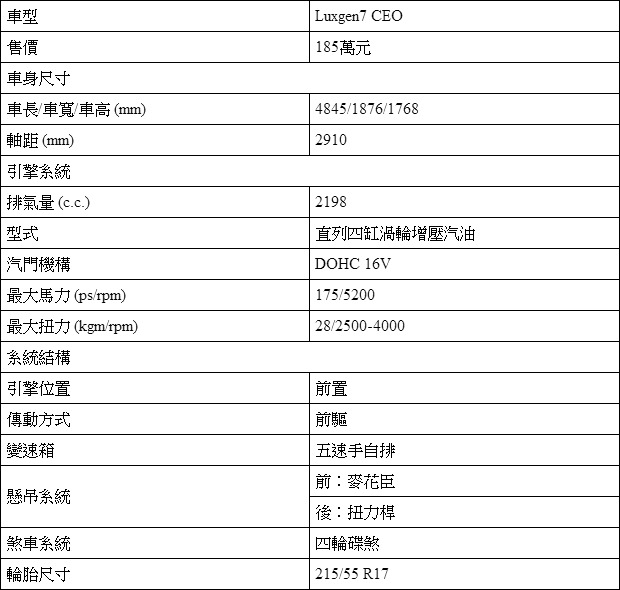 同樣可輸出175匹最大馬力的2.2升直四渦輪增壓引擎與五速手自排,確保Luxgen7 CEO依舊保有流暢動力表現。