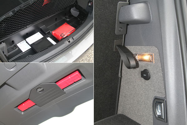 後廂底版下方具備置物盒空間,且一側還提供照明功能與12V插座;三角警示牌則安置於尾廂門內側。