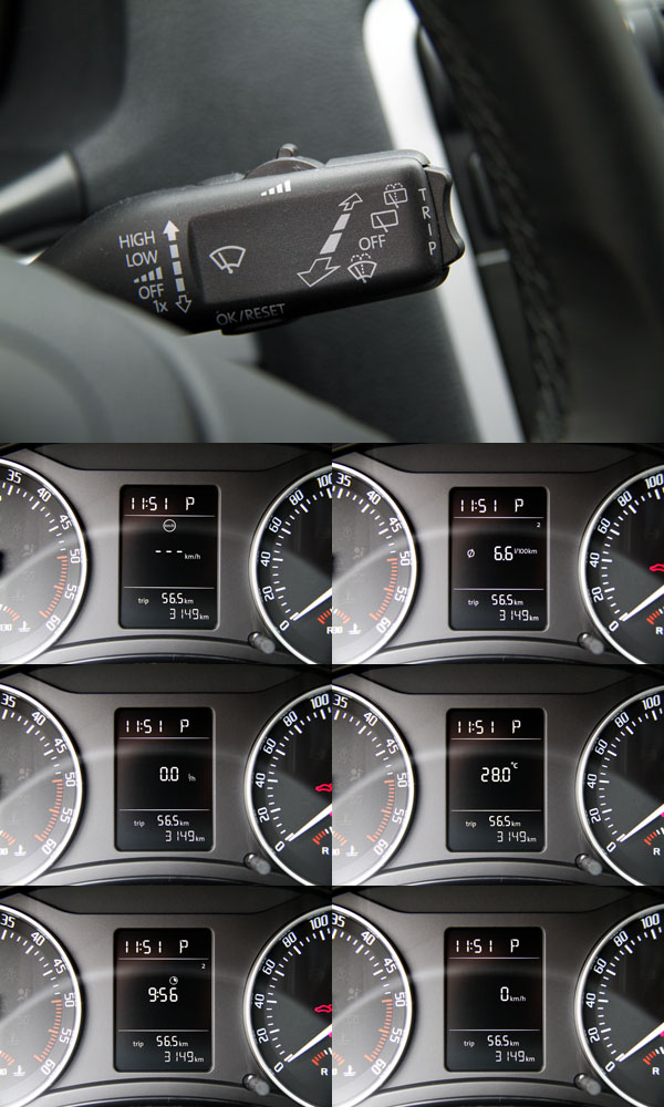 Octavia Combi 1.6 TDI儀錶板中附有多功能顯示幕,可提供瞬間油耗、平均油耗、車外溫度等資訊,並且由雨刷撥桿上的按鈕切換。