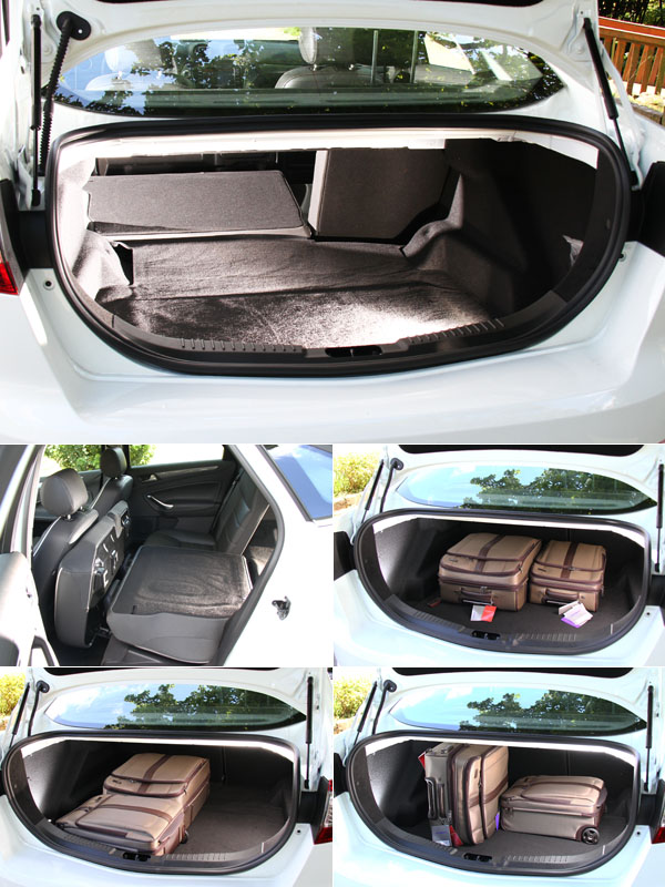 Mondeo車型後廂空間變化需要將後座椅面掀起後再將椅背前倒,程序較為複雜,但後廂空間較為平整(示範旅行箱為Samsonite商務公文Quadrion Pro系列產品,較大款者為四輪可擴展拉桿箱,尺碼為48x6629/34cm;較小款者為移動辦公室,尺碼為40x55x23cm)。