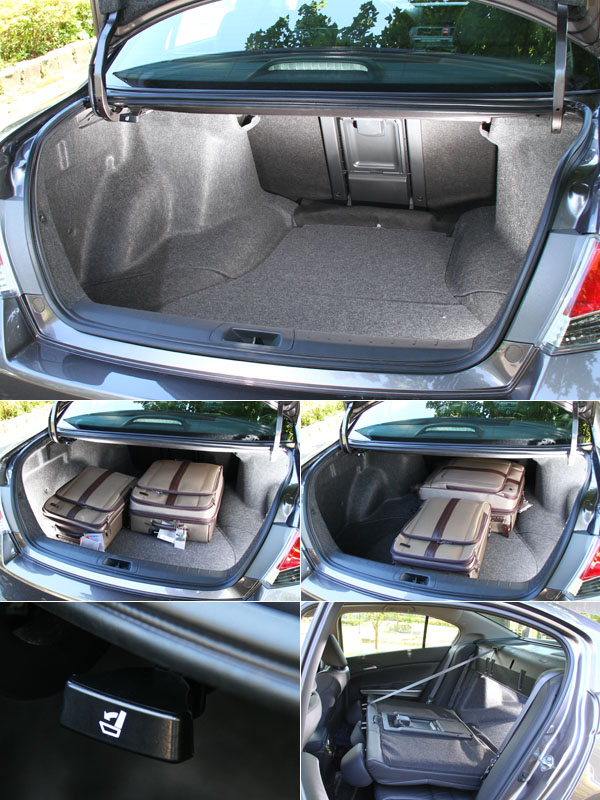 Accord於後廂提供後座椅背釋放拉桿,但拉下後依舊需要以人力將椅背往前推下,好處是無需再掀起後座椅面;後廂空間受到兩側後輪拱影響,平整度打上折扣。(示範旅行箱為Samsonite商務公文Quadrion Pro系列產品,較大款者為四輪可擴展拉桿箱,尺碼為48x6629/34cm;較小款者為移動辦公室,尺碼為40x55x23cm)