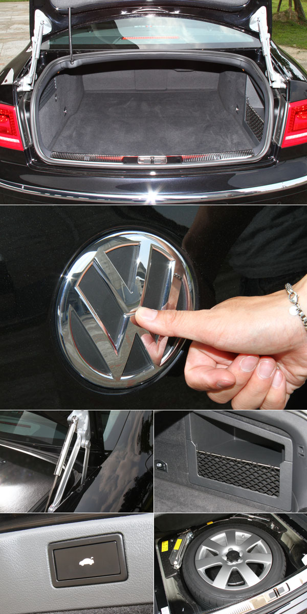 後廂置物容積十分寬敞且方正,開啟方式只需按下車廂上的廠徽即可,採電動開啟/關閉設計;車廂下備胎為全尺碼規格。