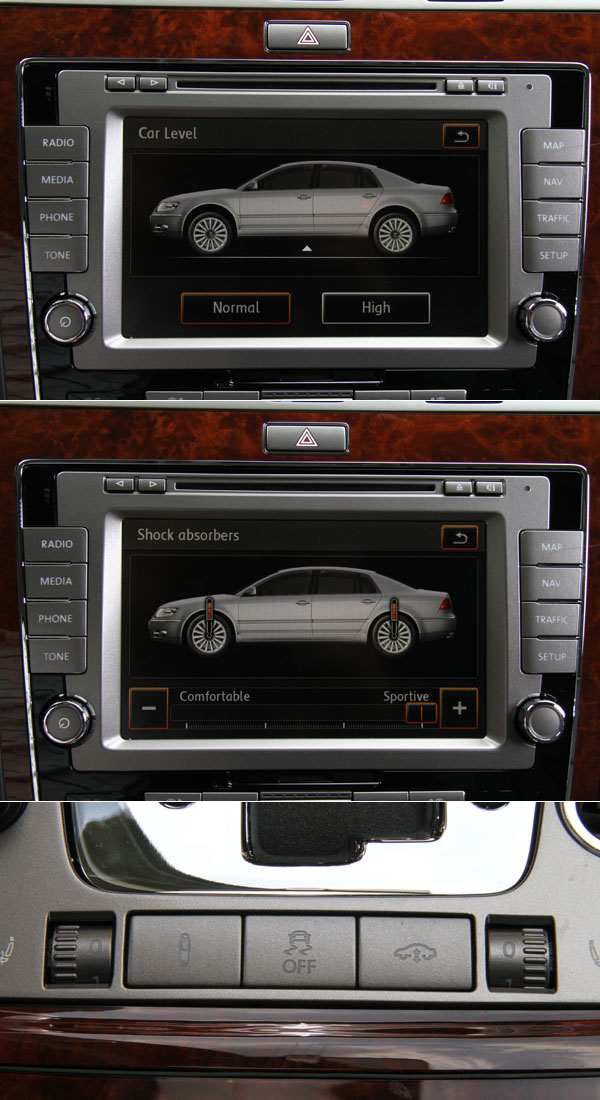 此次引進的Phaeton全車系皆配備CDC主動式氣壓懸吊,車主可由中控台上觸控螢幕針對車高與阻尼進行不同高度與模式的設定。
