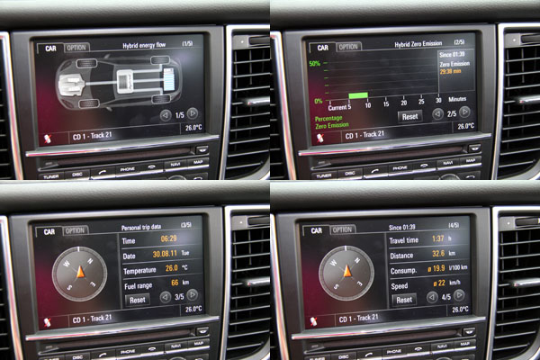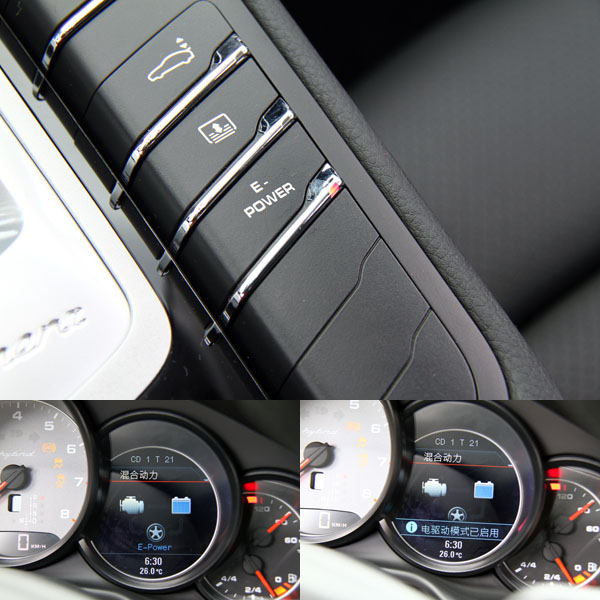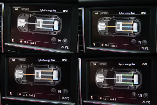 試駕當天,對於Panamera S Hybrid多元的動能變化,我們皆一一做了測試,而所有動力系統的轉換,皆可由中控台中的多功能螢幕顯示,讓駕駛可充分掌握動力切換狀況。首先在市區試駕過程中,多次欲使用「E-Power」純電動模式行駛,利用電動馬達的大扭力輔助低速行駛,但是卻因為紅燈起步後必須隨時跟上前車速度,需要較多動力,且在乘載三人下,車重早已超過兩噸,因此馬達瞬間的動力輸出還是有限,因此必須深踩油門啟動汽油引擎,以獲取足夠的動力,使得使用真正純電動模式行駛的距離與時間並不多,加上當引擎休止後,電動馬達還必須負載車用所有電器所需用電,因此電池消耗速度頗快,所以要充分使用電動模式並不容易;根據原廠表示,油門踩下角度在12度以內就會以電力驅動為主,因此,僅有於停車時或短距離行駛等緩加速情況下,較能夠使用全電動模式。