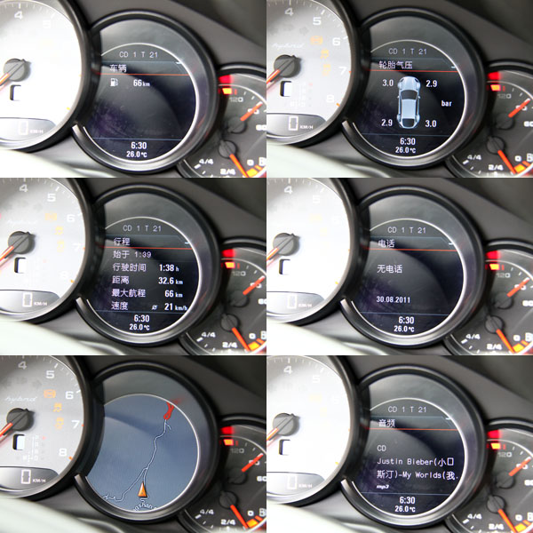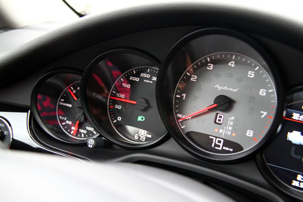 Panamera S Hybrid在儀錶板中右側第二個儀錶為多功能顯示液晶螢幕,可提供行車電腦、胎壓、通訊、音響與衛星導航等功能顯示。