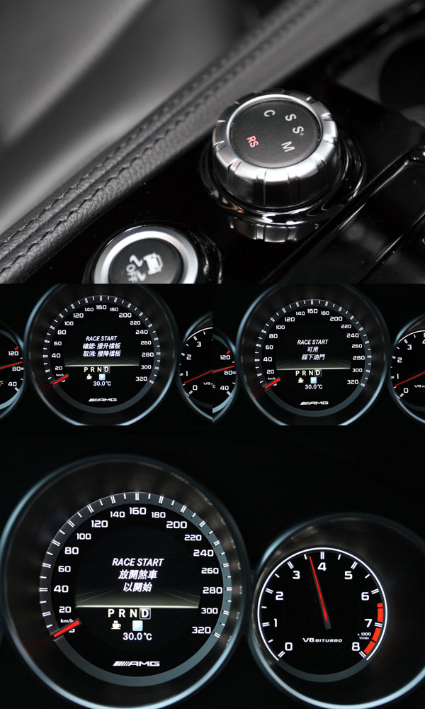 若要RACE START起步模式,只要輕撥方向盤右後方的升檔撥片即可進入RACE START起步模式,此時即可眾踩柱煞車,深踩油門、拉高轉速起步。