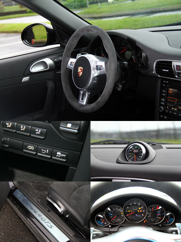 相較於Carrera 4 S,911 Carrera 4 GTS在外觀上導入了全黑SportDesign套件,前下擾流翼與側裙都有所不同,左右雙出式排氣管也採黑色式樣,內裝部分,則是選擇「Black Alcantara」基調,包括座椅中央與方向盤等都使用Alcantara材質包覆,做出區隔,此外,本次試駕的試乘車另選配了全功能電動天窗、BOSE環繞音場系統、內建式六片CD換片音響主機、跑車計時升級套件、停車測距輔助系統、自動防眩後視鏡、雨滴感應雨刷、彎道輔助照明功能、定速巡航系統、行動藍牙裝置、通用音源介面與後座座椅等配備,頭枕也烙印有Porsche的盾牌廠徽,共計約31萬元的配備。也許有許多人會認為上述許多配備都是相當基本的項目,然而如今已經有越來越多消費者希望可以有更多的自主選擇配備的空間,而Porsche則是在這方面落實得最具成效的車廠之一,讓每一位車主都可以依喜好與預算,充分自主地搭配愛車配備。