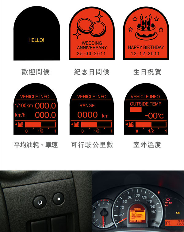 儀錶板中內建智慧E化輔助資訊系統,貼心提醒車主所有生日、紀念日,大小事通通牢記,更提供多種行車資訊警示功能,所有功能都可以藉由中控台左側下方的按鈕調整。