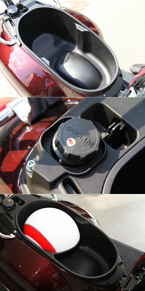 坐墊下置物空間一覽,僅可以放入一頂3/4罩安全帽;機油加注孔位於坐墊後,需打開椅墊方可操作。