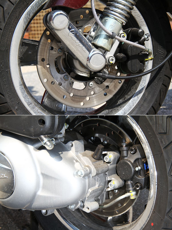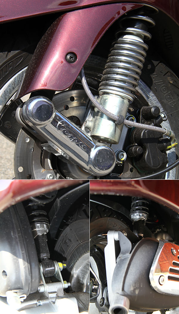 雙後避震的結構,透過車重的壓制,反應與前懸吊一致,且透過一體式鋼製車身的均衡傳達,取代了此設計常見的直接衝擊,縱使腳下胎圈規格僅有12吋的大小,但傳遞於騎士體感的緩衝,有著媲美大輪速克達的滿意。