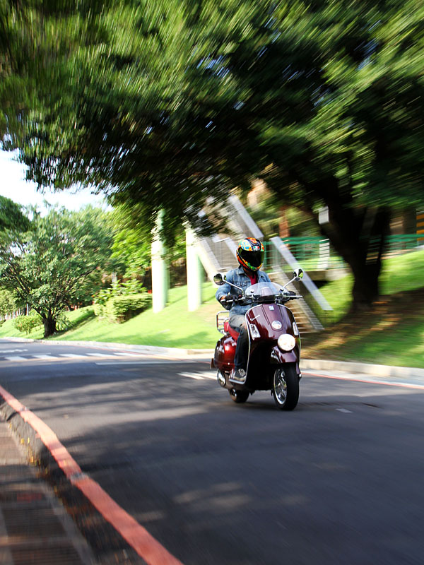 當然,158kg的車重,或多或少是會在每次得重心轉換過程中,留下些許的痕跡的,與S 150 ie相較,加上位於前土除上的頭燈重量,那車頭的輕盈感減少,但取而代之的也不是過份的笨重,而是種前後均衡的沉穩,低重心的特色,也支撐著每次過彎時的穩定,搭配上從未改變的單搖臂之前懸吊設計,不疾不徐的Q感作動,就好比前後配重的中庸,與優雅身型的姿態;不躁進、不遲緩,經過每個道路坑洞,撫平的動作輕柔,不僅與台北坑巴道路意外的相處和諧,與其設定的通勤需求,也有著恰如其分的搭配。