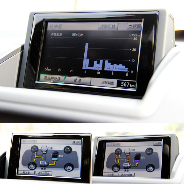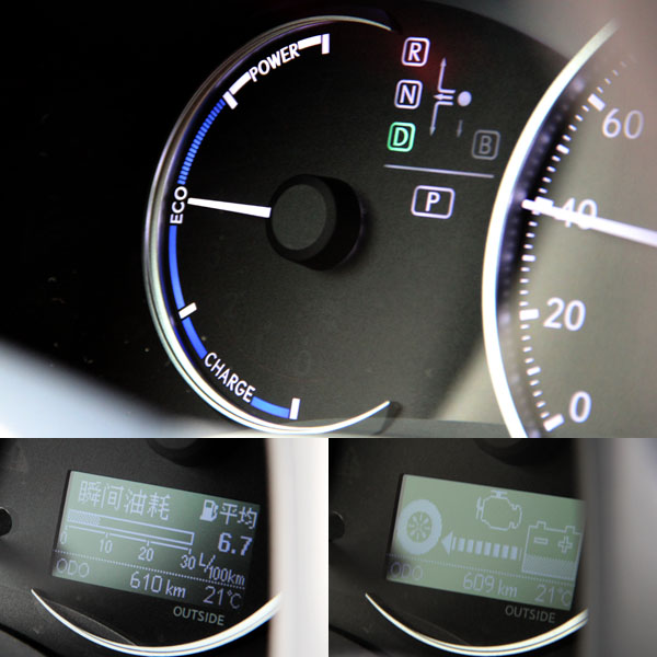 以節能為主要訴求的CT 200 h車系,可借由儀錶板中右側的液晶螢幕整握動力切換狀況與瞬間油耗等資訊,並且也可以由左側的動力輸出狀態錶,控制油門深淺,達到理想的油耗表現。