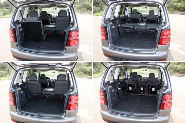 Touran 1.9 TDI採三排七人座座椅配置,並擁有8種基本變化,行李廂空間可由695公升至1989公升做彈性調整。