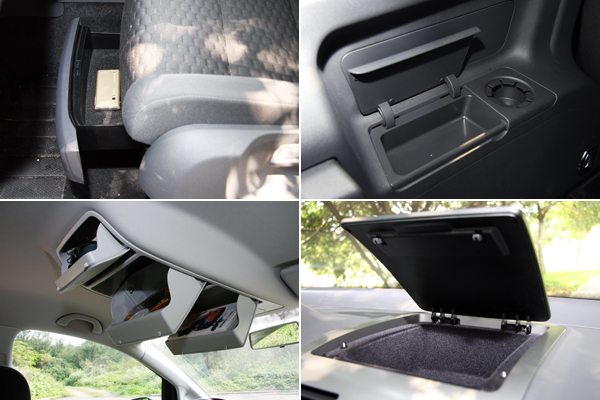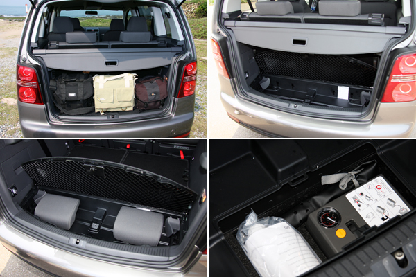 當採三排七人座安排時,最後方仍具有一定的置物空間,第三排座椅椅背需向前放倒時,頭枕則可收納至行李廂下方,同時為了節省空間,也取消了備胎,改配置補胎器具。