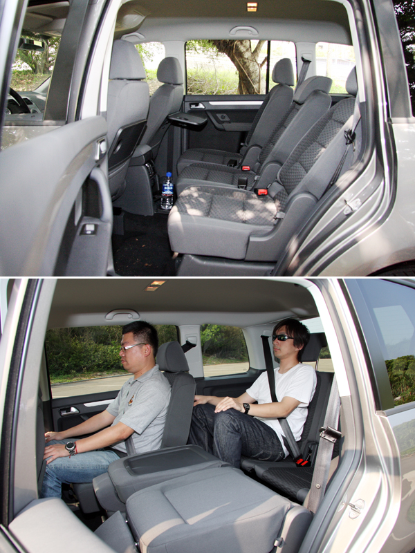 然而在Touran這種以家庭使用為主要訴求的車款上,乘坐舒適性才是買家關注的焦點,因此在乘坐舒適性上,整體的底盤設定在為了能夠載重下,略為硬朗,但隨著乘坐人數增加,適切地對於懸吊造成壓縮,乘坐感也會跟著進步,當我們順路載著大學生返回淡水時,車輛在全附載下,遇到起伏路面時車輛的擺幅也會跟著減少,對於彈跳的反應也會跟著比較沉著,彈跳感會較輕載時輕微,平時當我們需要乘坐多排座位設定的車種時,都知道容易暈車的人盡量乘坐車輛中段或前方之座位,但是於Touran上即使乘坐於第三排座位,也不用擔心被擺得頭暈腦脹,因此,整體而言,Touran在任何乘載情況下都可以有水準之上的表現。空間部分,三排座位都可以提供身高175cm以內的乘客完整地乘坐空間,依據我們乘坐第三排座位超過30分鐘以上的時間,仍未感受到不適感來看,只要不是人高馬大的乘客,空間上都相當夠用。