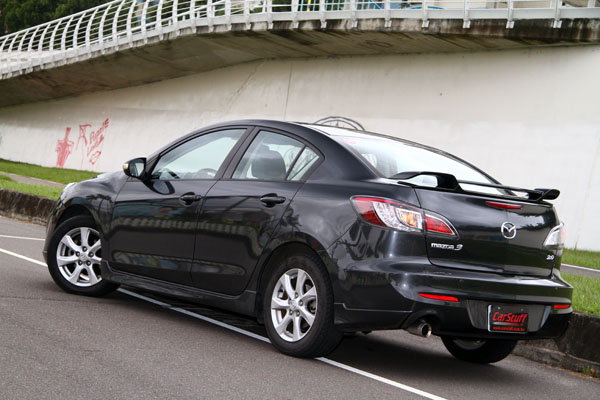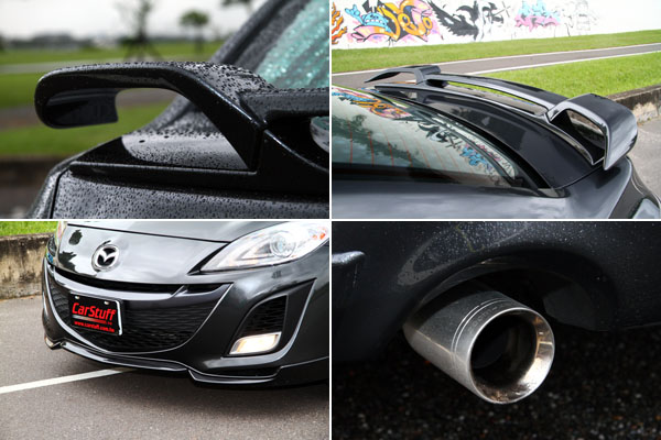 原廠所提供的Mazda3 2.0影音旗艦版試駕車,另選配了專屬的「御裝套件」,在外觀上包括了前下擾流翼、後保桿側裙、尾翼與金屬排氣尾飾管等套件,其中以後尾翼造型最為特別搶眼。