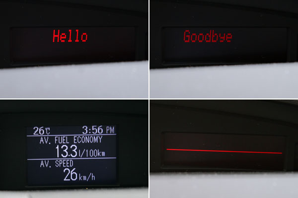 在改配置數位影音娛樂系統後,原本的音響顯示幕便僅保留"Hello" , "Good Bye"顯示功能,一般狀態下僅會出現一條橫條線,在音響功能顯示幕左側的則是行車資訊顯示系統。