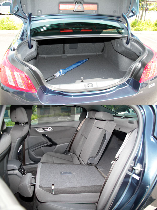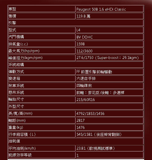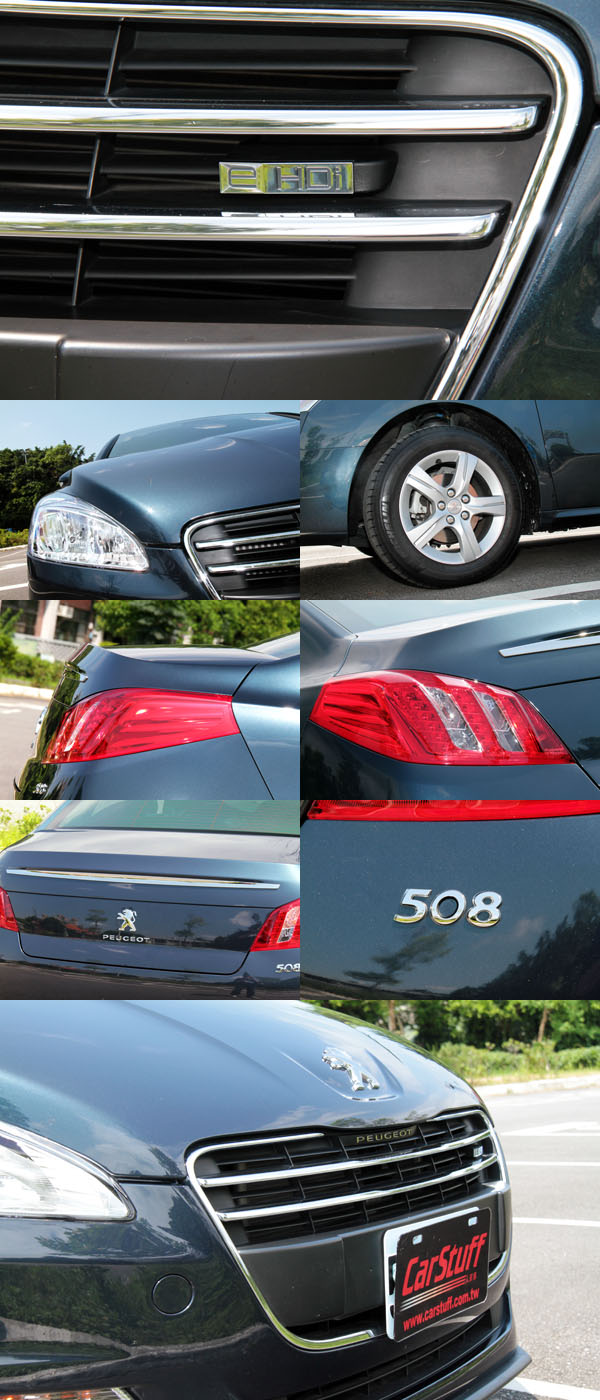 相較於車系中其他車款,508 1.6 eHDi在外觀上僅能由水箱護罩內的〝eHDi〞銘牌作為辨別,其於都大致相同;座艙中,本次試駕的508 1.6 eHDi Classic入門版本,少了抬頭顯示幕與真皮座椅等配備,但是恆溫空調、定速巡航系統、6氣囊等仍為標準配備;車內空間部分,全新的508在放大車身尺碼與拉長軸距後,獲得大幅精進,另外,在行李廂容積部分更有545L的表現,甚至強過於大型房車水準,若是將後座椅背放倒,還可以擴展到1581L,運載能力相當優異。
