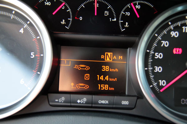 在經過行駛達超過150km的試駕,508 e-HDi最大的優勢還是在節能表現上,在行車電腦歸零後,共行駛158km,結合了高速公路與一般省道,同時也遇到了塞車的情形,總結行車電腦顯示的平均油耗為14.4km/L,比起許多中大型房車都還要亮眼許多。