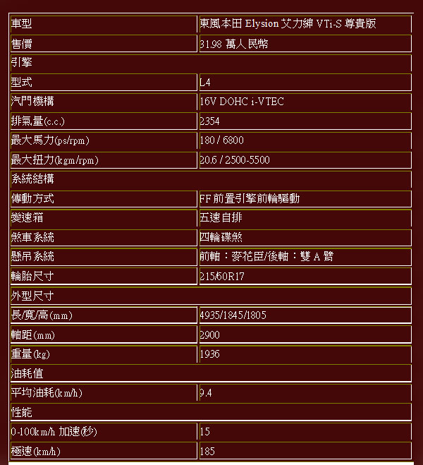 本次試駕的Elysion艾力绅VTi-S尊貴版,建議售價為人民幣31.98萬,約折合新台幣150萬左右,比起Toyota Priva 2.4 GL還便宜,雖然是中國現地生產,但是組裝品質完全符合原廠標準,一點也不會有任何所謂中國製的不良品質;在中國市場,Elysion艾力绅是第一款投入現地生產日本大型MPV〈Toyota Alphard埃爾法與Nissan Quest貴士仍為進口車款〉,展現Honda積極擴展中國市場的企圖心,但Elysion艾力绅也必須去挑戰已經於中國暢銷已久的Buick GL8系列等所謂地高端MPV,仍有一番硬仗要打。至於台灣部分,目前則尚無引進計畫。