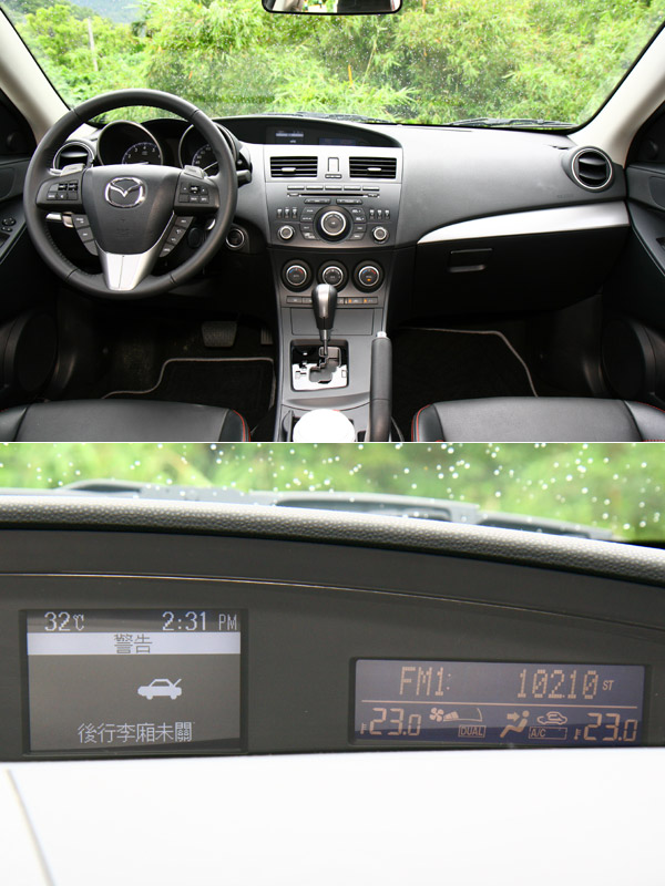 小改款Mazda3將中控台改以黑色為基調,而最上層的資訊顯示,也從原本的紅光改為藍色背光,且全面更新為繁體中文化。