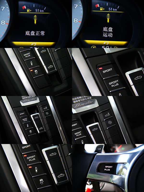 在中央鞍座上的控制介面,為車載電子輔助系統的控制中樞,具有標準配備的「SPORT」運動按鈕、選配之跑車計時套件增加地「SPORT PLUS」運動升級按鈕、選配之PASM保時捷主動式懸載調整系統、標配的PSM保時捷車身動態穩定系統 ,以及電動尾翼控制鈕、Star&Stop引擎自動啟閉功能與電動敞篷控制鈕等。