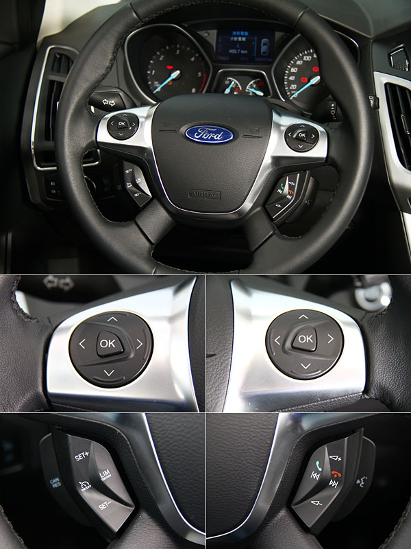 四幅式方向盤整和諸多功能操作介面,包含有左上方的行車電腦、右上方的SYNC系統、左下方的定速與右下方的語音操作與電話撥接功能等。