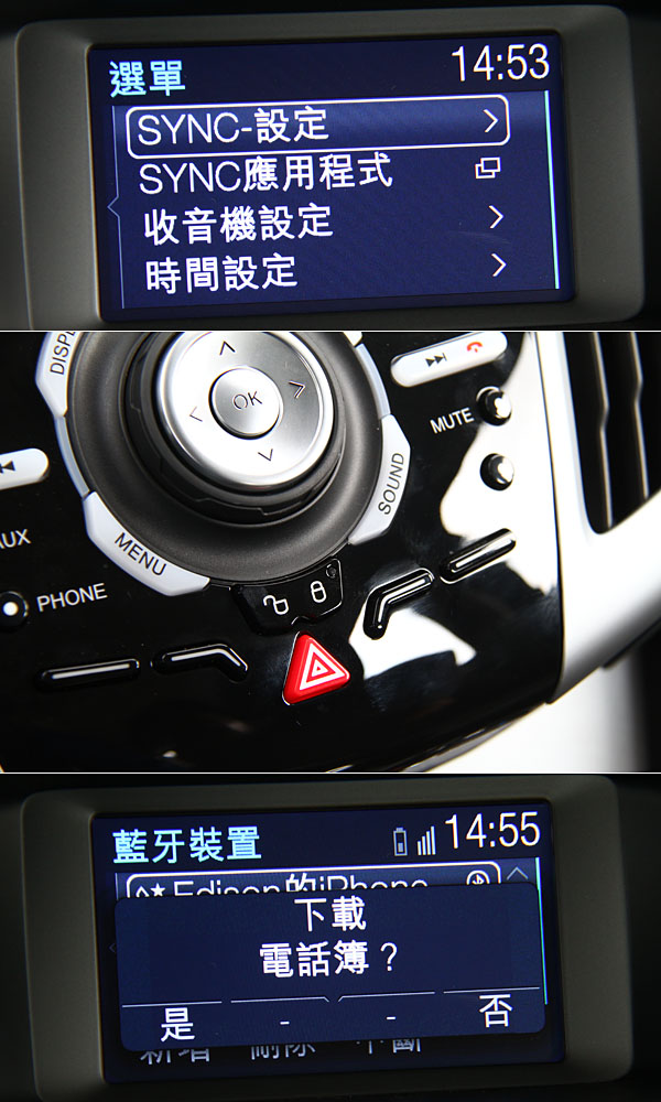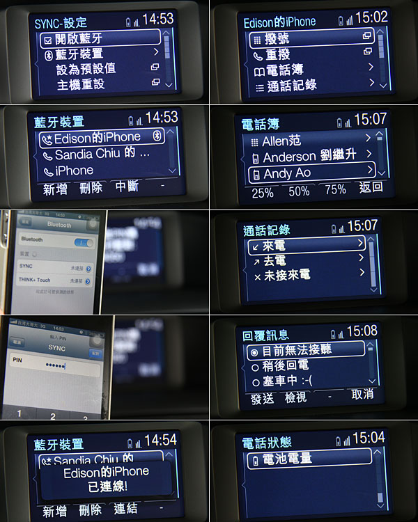 與行動電話的整合功能,除了電話簿以外,通話紀錄等也包含在內,幾乎可以讓SYNC完全接掌你在車室內的通訊功能,對於主動行車安全自是有所提升,且對於台灣消費者對於3C科技的高度關注,以中文為介面的SYNC,相信可以真正程為主打項目之一,不再只是淪為不實用的賣點。