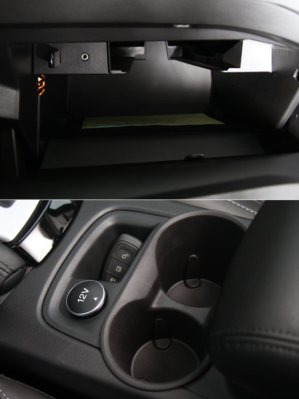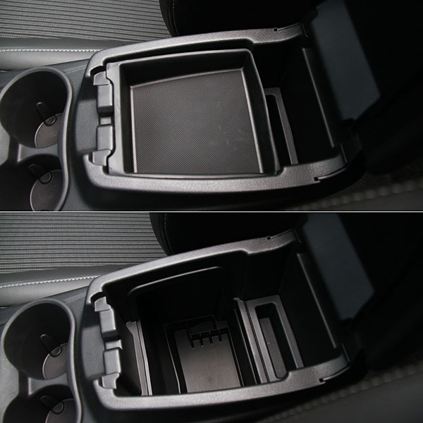 雙置杯架與雙層中央扶手置物盒設計。