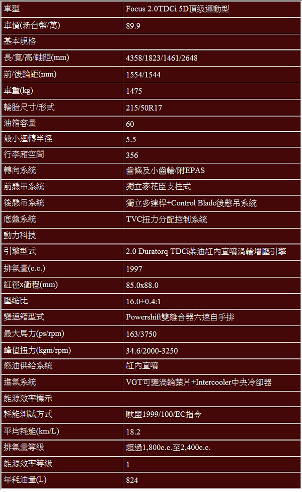 Ford Focus 2.0TDCi 5D五視圖與基本規格
