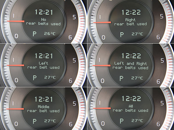 後座安全帶警示系統相當聰明,無論左、中、右的乘客是否有繫上安全帶,都會顯示在此螢幕中。