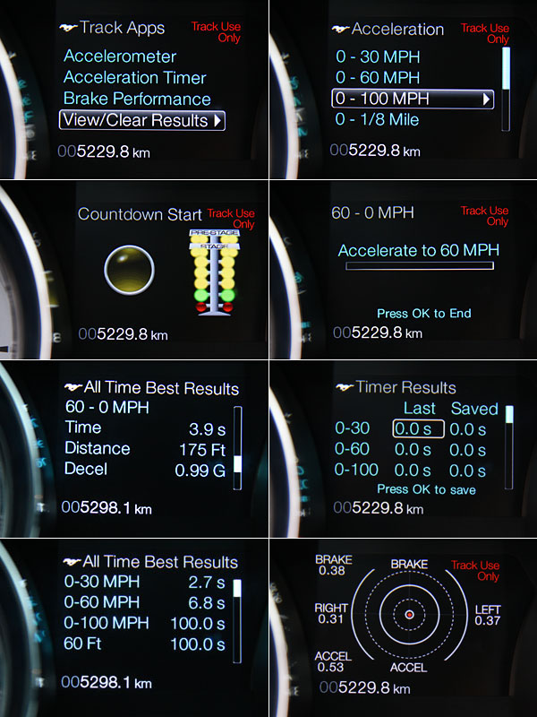 如組合圖顯示,Track apps賽道程式中提供多種距離的加速測試,還有G值測試表,且為了模擬賽道感受,連起跑燈都可以選擇耶誕燈方式,十分有趣。