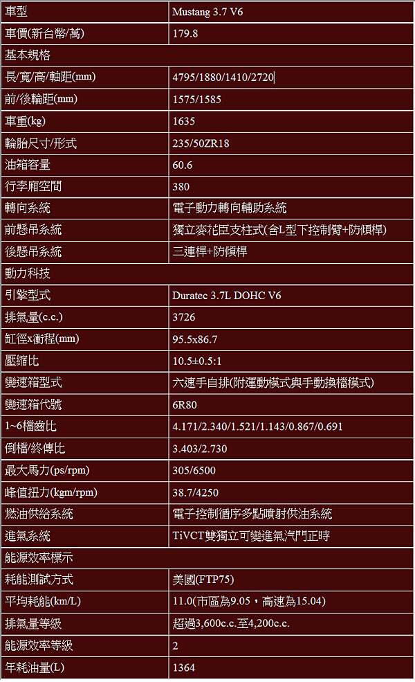 Ford Mustang 3.7 V6基本規格表與五視圖
