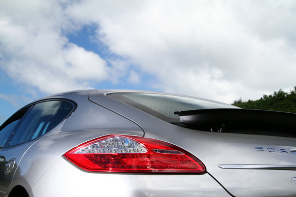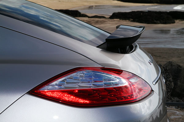 Panamera車尾設有一片式的電動升降尾翼,與Panamera Turbo的多片式設計有所不同。