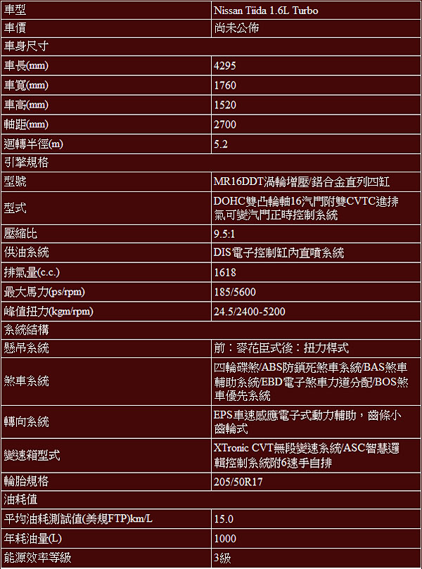 Tiida 1.6L Turbo搭載的1.6升缸內直噴渦輪增壓引擎,具備有185ps/5600rpm最大馬力與24.5kgm/2400-5200rpm峰值扭力輸出。