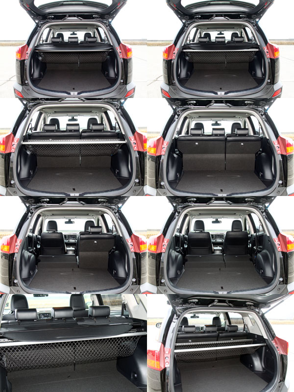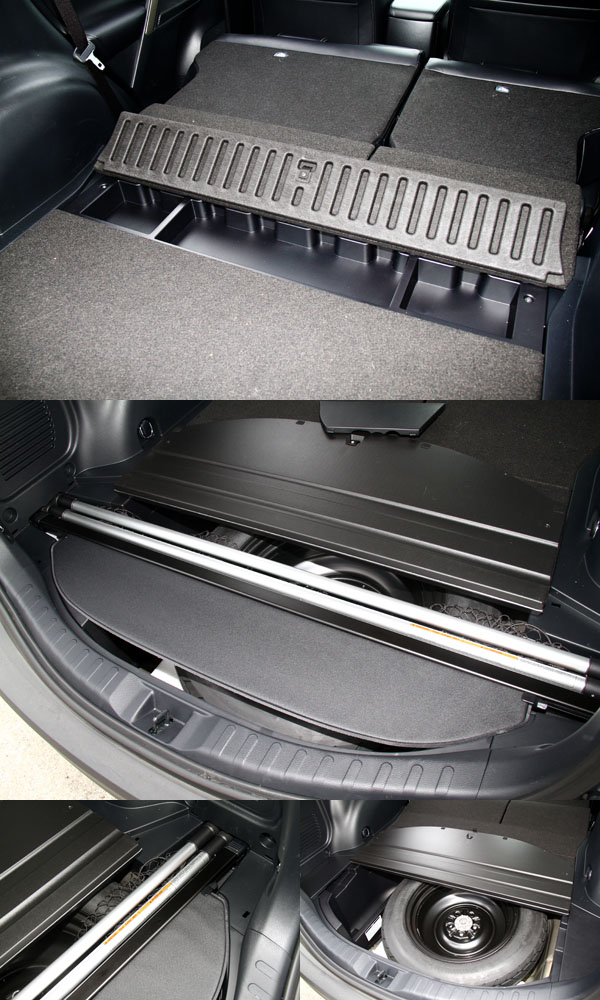 在全新RAV4上另一個重要的改變,就是將原本側開式的尾門改為上掀式設計,並且將原本外掛式備胎移至行李廂底板下方,並且充分利用車內空間,在行李廂底板下規劃其他置物空間,並且可將置物捲簾與行李廂置物網收納於其中;而在上一代車型中,於行李廂兩側設置的One-Touch後座椅背翻倒機制則取消了,將拉柄移至座椅側面,便利性略為打折。