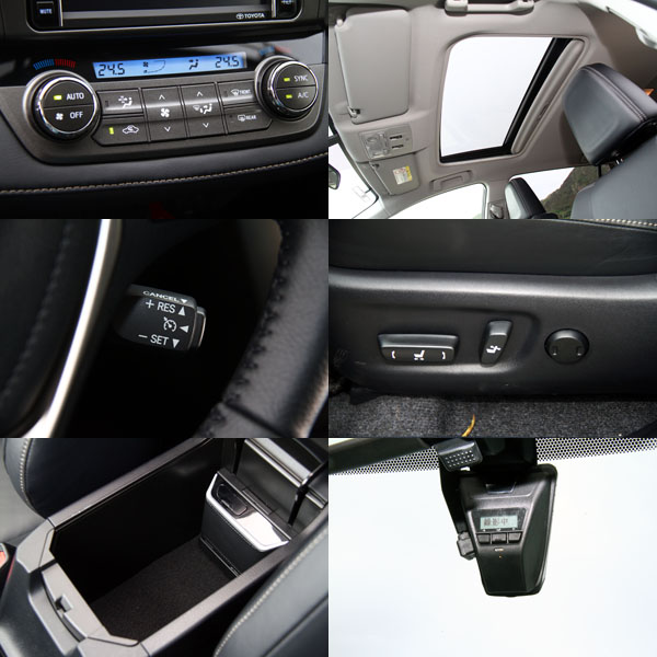 在頂級的RAV4 2.5 4WD車型上,配有雙區恆溫空調、電動天窗、定速巡航系統、駕駛座八向電動調整座椅〈附電動腰靠〉、行車紀錄器等配備。