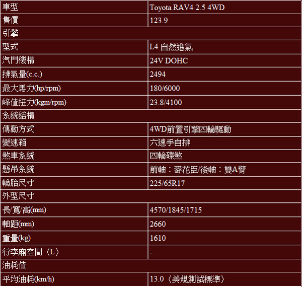 整體來說,在與RAV4 2.5 4WD相處了一天,行駛了超過130km,基本上它並沒有太明顯致命的缺點,車輛本質上有明顯的進步,已經足夠讓總是認為Toyota車款操控不夠好的人開始改觀,真的要雞蛋裡挑骨頭,我只能想到它少了自動啟閉頭燈和雨刷,或者是2.5升引擎在稅負上較為吃虧,不過這些其實都瑕不掩瑜,而它123.9萬的建議售價與純日本原裝進口,又讓它比進口同級車更具競爭力,而且它不僅對於進口對手帶來強大威脅,甚至將持續壓縮到國產SUV的空間,在此之前,我們常在討論RAV4是否該導入台灣生產的問題,然而當全新RAV4發表上市,打出漂亮地價格時,就會發現若能以進口方式引進,打上日本組裝的品質做為亮點,可以同時上打進口對手、下踢國產SUV,其實並非得要投資生產線在台生產。