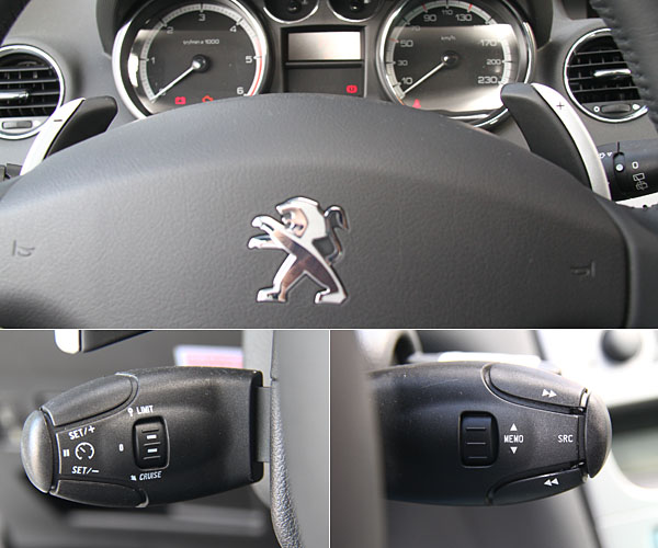 方向盤後方除了有換檔撥片外,下方兩側也分別有著音響控制介面與定速巡航裝置。