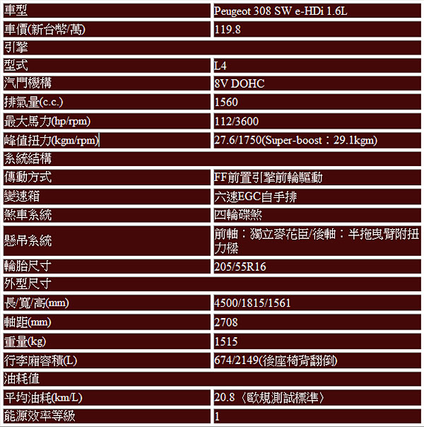 此次試駕的Peugeot 308 SW e-HDi 1.6L,車價為新台幣119.8萬元。